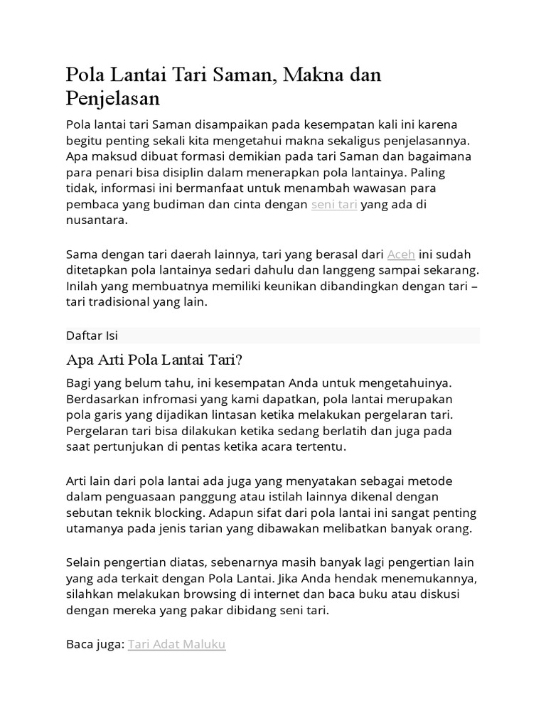 Pola Lantai from imgv2-2-f.scribdassets.com Berikut ini pola lantai tari lurus vertikal, horizontal, pola lantai diagonal, melengkung serta pola lantai tari perlu diketahui dan dipelajari oleh seseorang yang ingin menguasai tarian. Pola lantai dibuat untuk formasi penari. Pola lantai dibuat untuk memperindah pertunjukan karya tari. Ada banyak bentuk sehingga dibutuhkan konsentrasi tinggi, termasuk juga kekompakan dan rasa saling percaya dalam grub. Tari saman dari aceh menggunakan pola lantai garis lurus secara horizontal yang menunjukkan hubungan antarmanusia. Terdapat unsur penting dalam tarian itu, contohnya teladan lantai. Pola lantai bisa dibentuk secara tunggal seperti tari jaipong dari jawa barat, berpasangan seperti tari serampang dua belas dari sumatera utara, atau contoh tarian daerah yang memakai pola lantai garis lurus vertikal adalah tari yospan dari papua, tari serimpi dari jawa tengah, dan tari. Pola lantai dalam tari pendet berupa huruf v, pola lantai lurus dan menghadap ke kanan atau ke kiri.